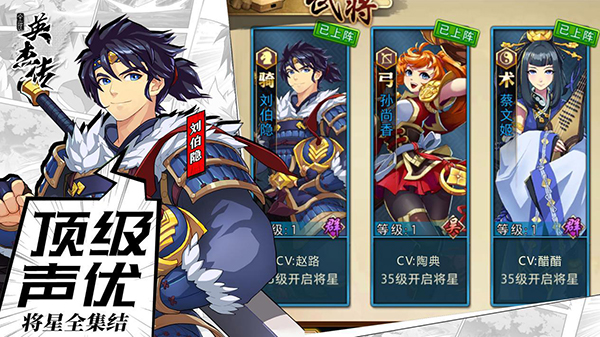 《全民英杰传》在传统三国故事的基础上启用全新剧情,除了全程采用国风动画过场外,还为了更好地展现出《全民英杰传》的国漫风格,特意邀请了国内顶级的动漫声优进行角色配音。曾为知名国漫作品《秦时明月》《全职高手》《中国惊奇先生》等作品配音的声优边江、赵路、醒醒、陶典、刘北辰等众多明星CV倾情演绎三国人物,曹操、刘备、孙权等角色跃然屏上,跌宕起伏的剧情让玩家们犹如亲历这段风起云涌的三国时代。
